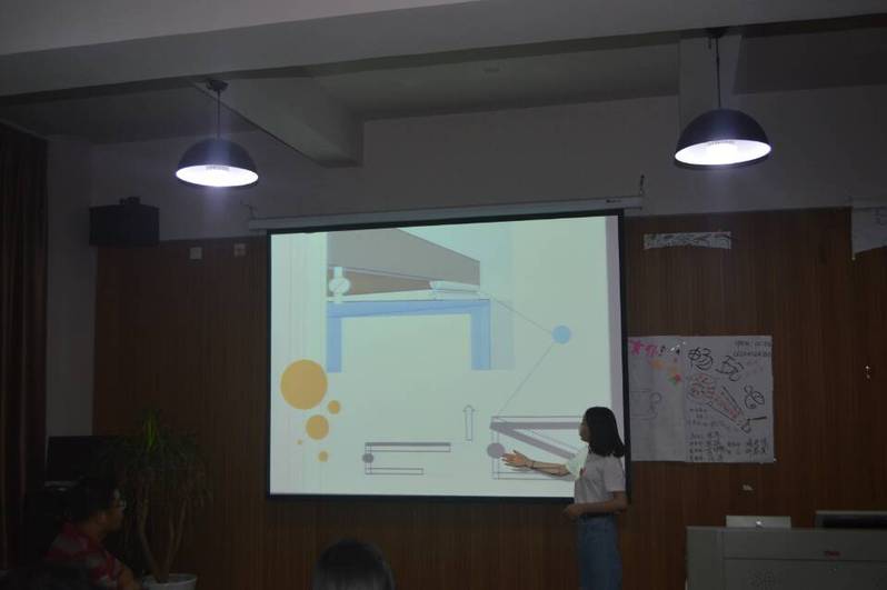 活动中,每组参赛选手有三分钟时间对所提交作品进行展示和阐述创意设计理念。评委根据选手阐述和作品所体现的科学性、普及性、知识性及趣味性综合打分。展示环节,参赛选手陶义同学为大家带来了一种新型生活用品——学生宿舍高层吊架,它可以代替人工取送物品,省时省力,收纳方便,减少了占地空间,具有极大的便利性。无独有偶,邵一迪选手则选择对现有物品加以创新改造。在她看来,现有健身器材卧推架具有死板、占地空间大、杠铃易滚动等缺点,对此,她设计推出新型单双臂卧推健身器,很好地解决了现有卧推架存在的问题。创新来源于实践,邢宏芙选手鉴于日常生活中速食食品高度发展,而包装盒的卫生、便捷和环保问题却差强人意的现实,发明出一种实用新型的包装技术。具体为一种焦馍防易碎打包盒,该产品具备防附着、防堆积、防易碎、防黏连的特点,解决了现有技术中的短板问题,具有更好的环境保护作用。一张张幻灯片演示,一个个实物场景,参赛选手向评委和在场观众们展示了他们的创意构思和创意成果,互相交流学习,取得了较好的效果。