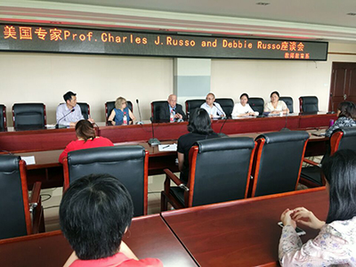 为更多地了解美国教育制度、美国学前教育的现状,深入学习和借鉴有关美国学生管理的法律及制度问题,6月1日下午,教师教育系(基础部)在行政楼三楼会议室组织开展了美国专家及教师座谈会,特邀美国查理卢梭(Charles J.Russo)教授、戴贝卢梭(Debbie Russo)担任座谈会嘉宾。座谈会由教师教育系主任秦东方主持,牛志奎教授、顾亮老师担任翻译。教师教育系领导及英语教育、大学英语、学前及教心教研室部分教师参加了会议。