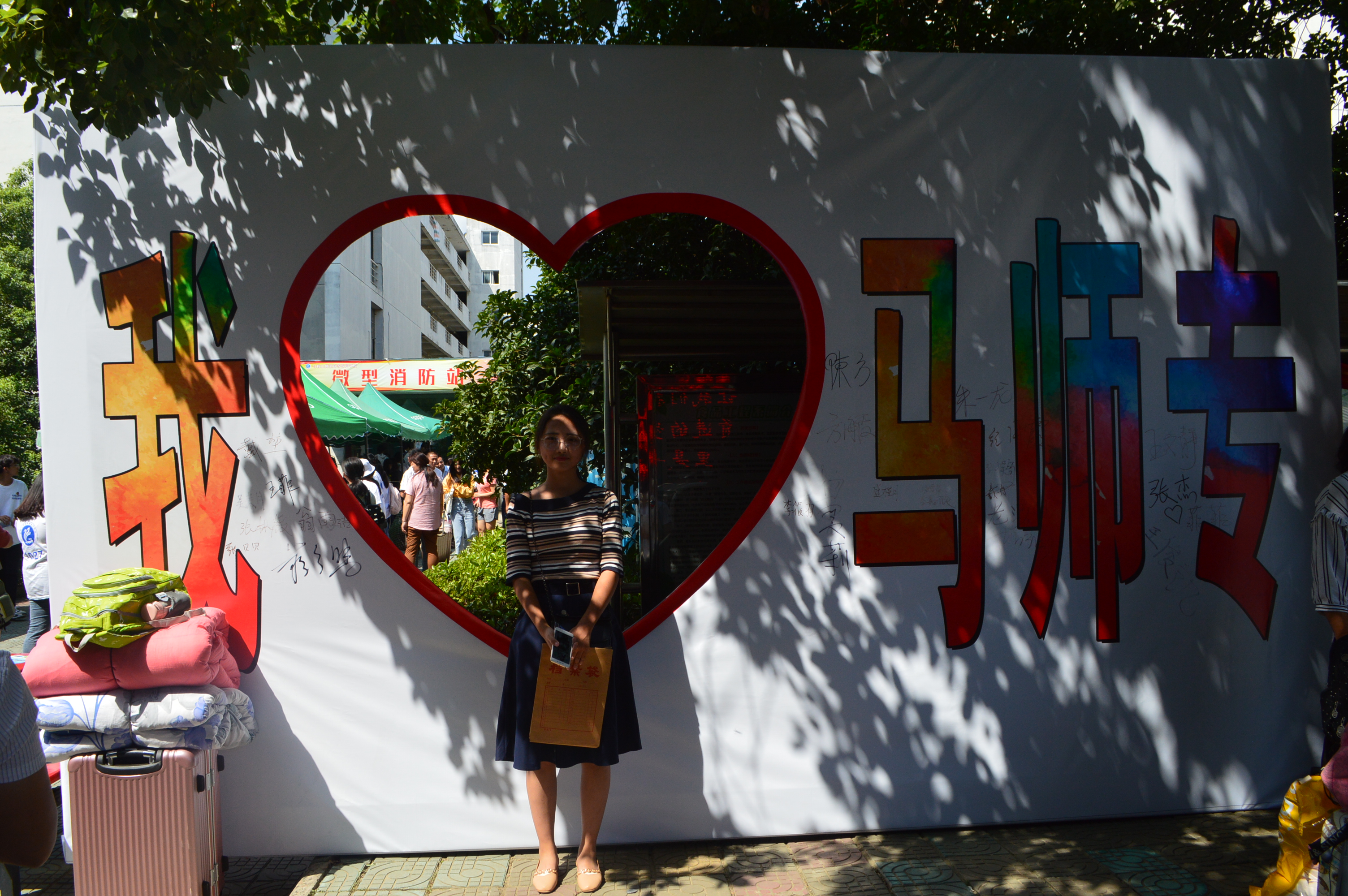 跟随着学长学姐,慢慢地熟悉学校的布局和环境,开始的紧张感、陌生感也渐消了不少。2018级英语教育2班的陈碧雅选择与“我爱马师专”合影留念,这里以后就是“家”了。