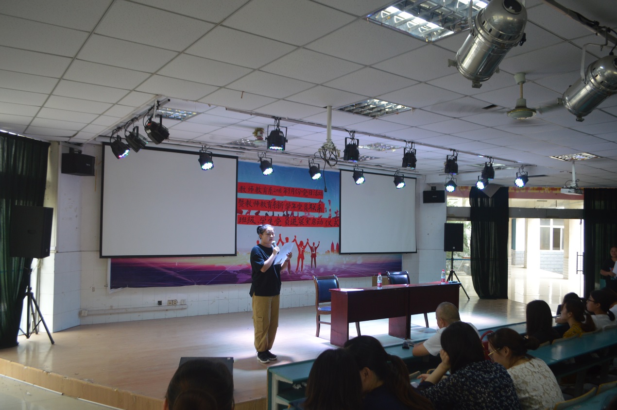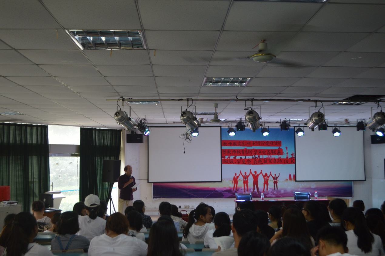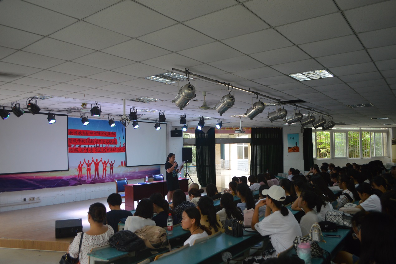 正值新生入学之际,为充分发挥学校党总支的核心作用和党员的先锋模范作用,促进学生管理,帮助学生更好的学习和生活,教师教育系(基础部)于9月7日中午在大阶梯教室(一)举行了本学期首次党日活动——2018-2019学年党员联系班级暨学生党员(入党积极分子)进新生宿舍启动仪式。校党委委员、副校长张勇军,教师教育系党总支副书记吴德琴,副主任陈小凤,团总支书记黄忻然,全体教师党员以及该系部全体学生党员、入党积极分子参加了该仪式。仪式由吴德琴主持,她首先肯定了教师教育系上一年度的工作并对本年度工作提出了要求。