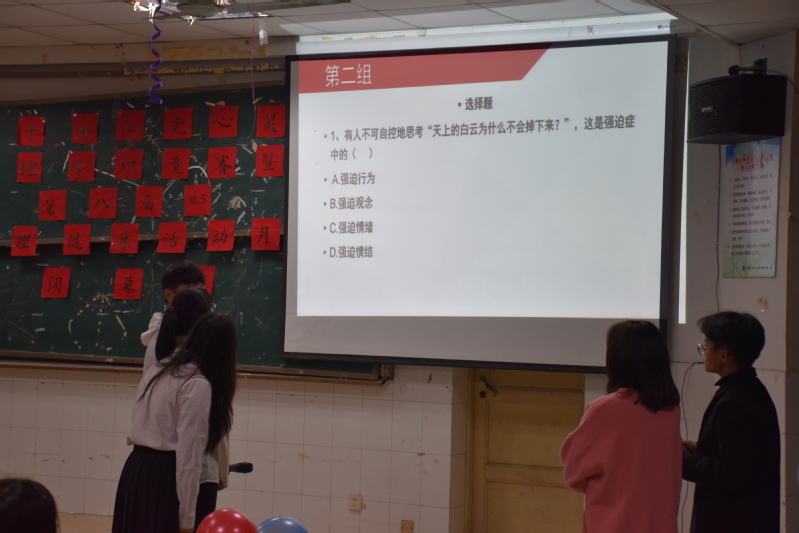 活动中,第一环节自我介绍,三位选手共同带来了手语表演歌曲《我们的未来》,“是我的依赖,仿佛我手中残留着片段的告白……”精彩的表演之后分别介绍了自己,精心的创意,完美的配合为他们迎来了观众们阵阵掌声。第二轮知识竞答环节,在有限的时间内,选手临危不惧,奋勇作答,选手之间相互配合,齐心协力,迅速有效的答对了所给题目。在第三轮的心理案例分析环节,马茜茜作为主力发言人,她和队友认真商讨的基础上结合三人观点,充分利用有限时间,对问题进行了细致剖析和完整回答,获得了评委们的一致肯定。
