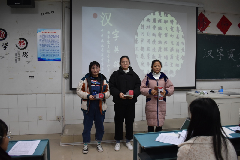 为了使活动更好地进行,活动伊始,主持人向大家介绍了此次比赛的流程和注意事项。据悉,大赛分为两个环节。第一环节是繁化简及你画我猜。各组选手凭着相互的默契和有趣的肢体语言与对手展开了激烈的“斗争”。在一组组选手激烈的对抗中,18级数学教育班和18级小学教育五班以8.45分的高分获得第一名,顺利进入第二轮比赛。共同进入第二轮比赛的班级还有18级英语教育二班和18级小学教育四班。第二轮比赛为听写词语和成语。各选手势均力敌,都在极力地展示自己的汉字功底。最终,18级小学教育五班的丁心怡以9.7的最高分获得本场比赛的第一名, 18级小学教育五班的李晨曦获得本场比赛的第二名。活动最后,学生会副主席徐畅向各获奖选手颁发了奖状及奖品。