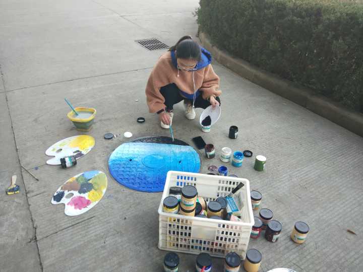经过前期的充分准备,即日中午,活动正式开始,也就是把设计好的图案画在井盖上。先用粉笔在井盖上画出图案,再调配颜料,逐一填空。“井盖特别不好画,丙烯颜料上色很难,需要涂很多遍。”2018级美术教育(1)班高奥杰说道。“参加此次井盖彩绘的同学有一班的,也有二班的,都是绘画比较好的,是在大家自愿报名的基础上筛选出来的。能够参加这样的活动,很开心。”“小时候最喜欢章鱼哥,所以画起来比较得心应手。”美教(2)班安佳乐开心地说道。他拿着刷子正在认真的涂鸦,四周围了不少观看的同学。