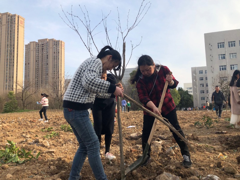 在每个小组老师的带领下,大家来到了植树地点,各个小组的成员都积极地去领取树苗,有樱花、桂花和紫薇三种树。老师们则拿着铁锹,在划好的区域内奋力地挖掘着。吴志华熟练地操起铁锹,不一会儿就挖好了一个树坑,接着,第二个、第三个树坑也很快挖好了。由于土地很干、很硬,老师们挖得并不轻松,同学们则有的去打来水浇灌到干涸的土地上,有的拿起铁锹同老师一起挖,在同学和老师的共同努力下,一个个树坑终于挖好了。