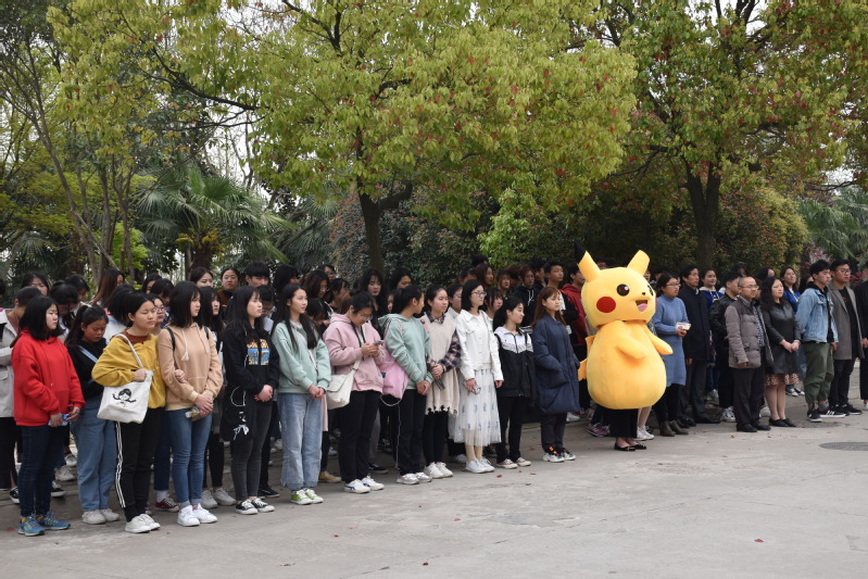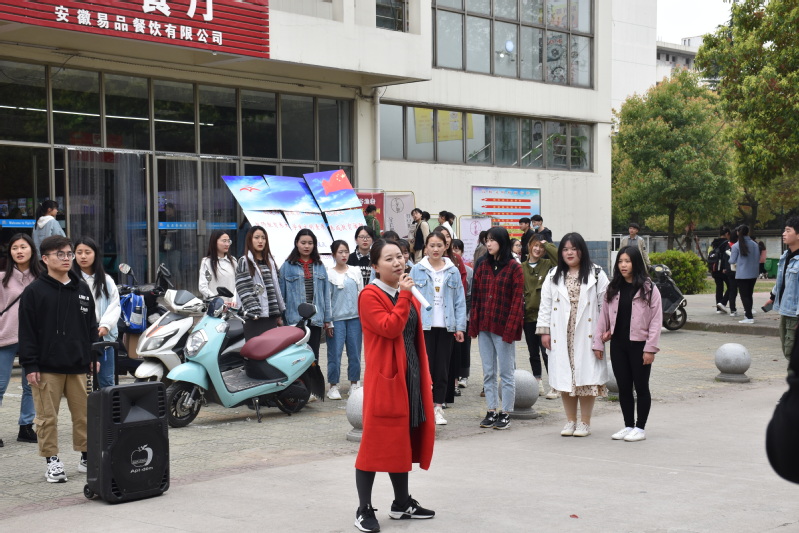 活动共分为三个环节,首先是快闪活动。由辅导员代表杨飞和学生代表缪国澳领唱《学习雷锋好榜样》与《我爱我的祖国》,同学们次第加入。在美妙的歌声中,同学们手拉手围成一个圈,代表着同学们的凝聚与团结。