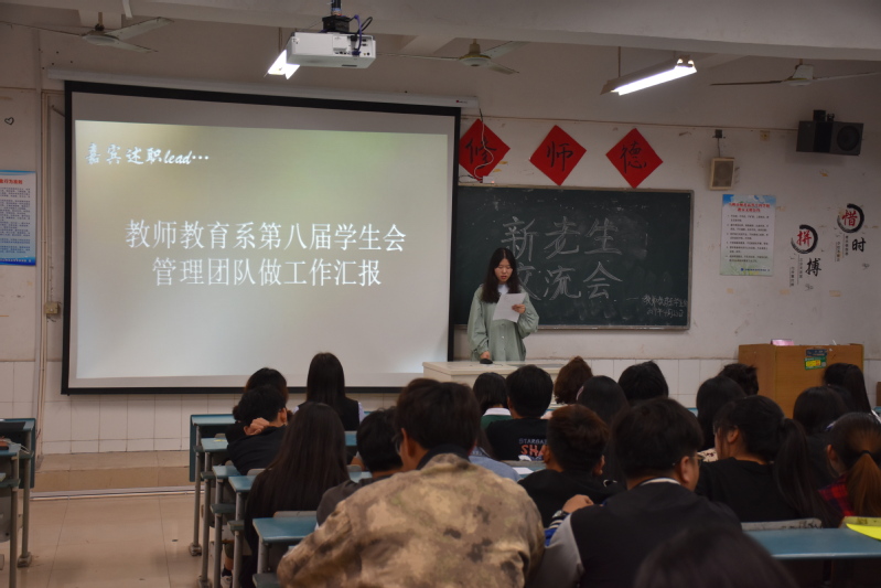 会议伊始,上一届学生会主席黄国慧宣读了新一届学生会主要负责人名单。随后,学生会老成员主席团和各部长依次上台汇报学年工作总结,他们或深刻反思、或谆谆教诲、或恋恋不舍,既对自己过去一年的工作进行了回顾,也对新一届成员提出了深切希望,希望新一届成员能把教师教育系学生会办出风格、办出特色。