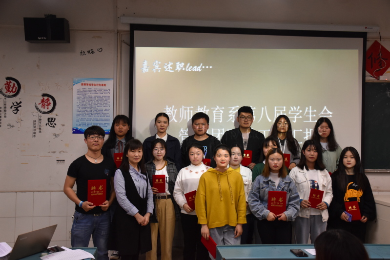 会议最后,与会教师为上一届成员班子颁发了聘书。新一届学生会主席王孝茹带领全体学生会成员就“教师教育系学生会誓词”进行宣誓。(图文/系办公室程明露 编辑/黄忻然 审核/陈小凤)