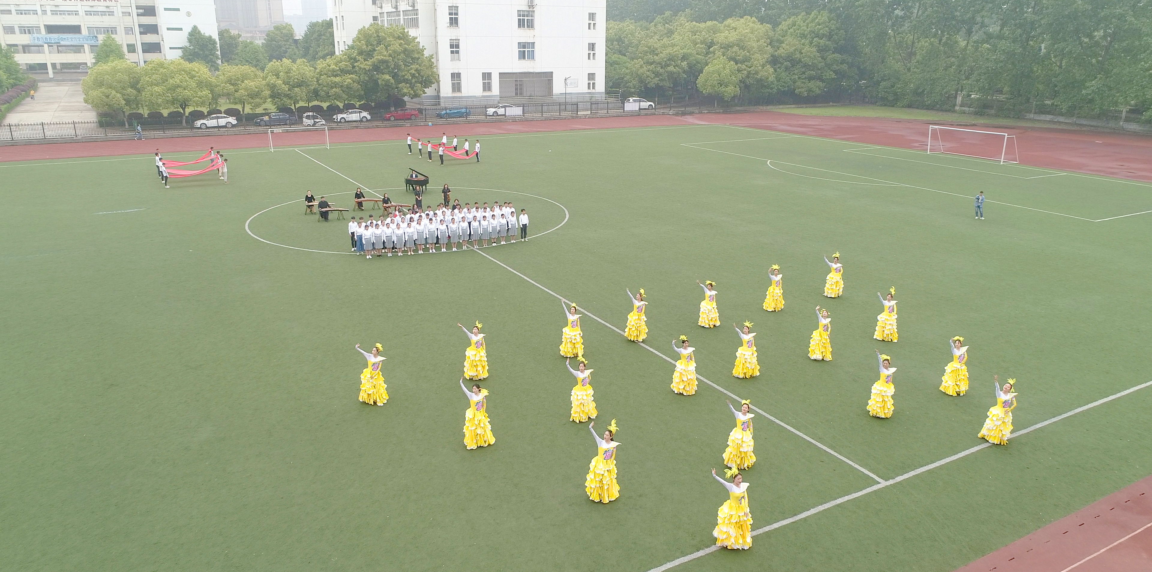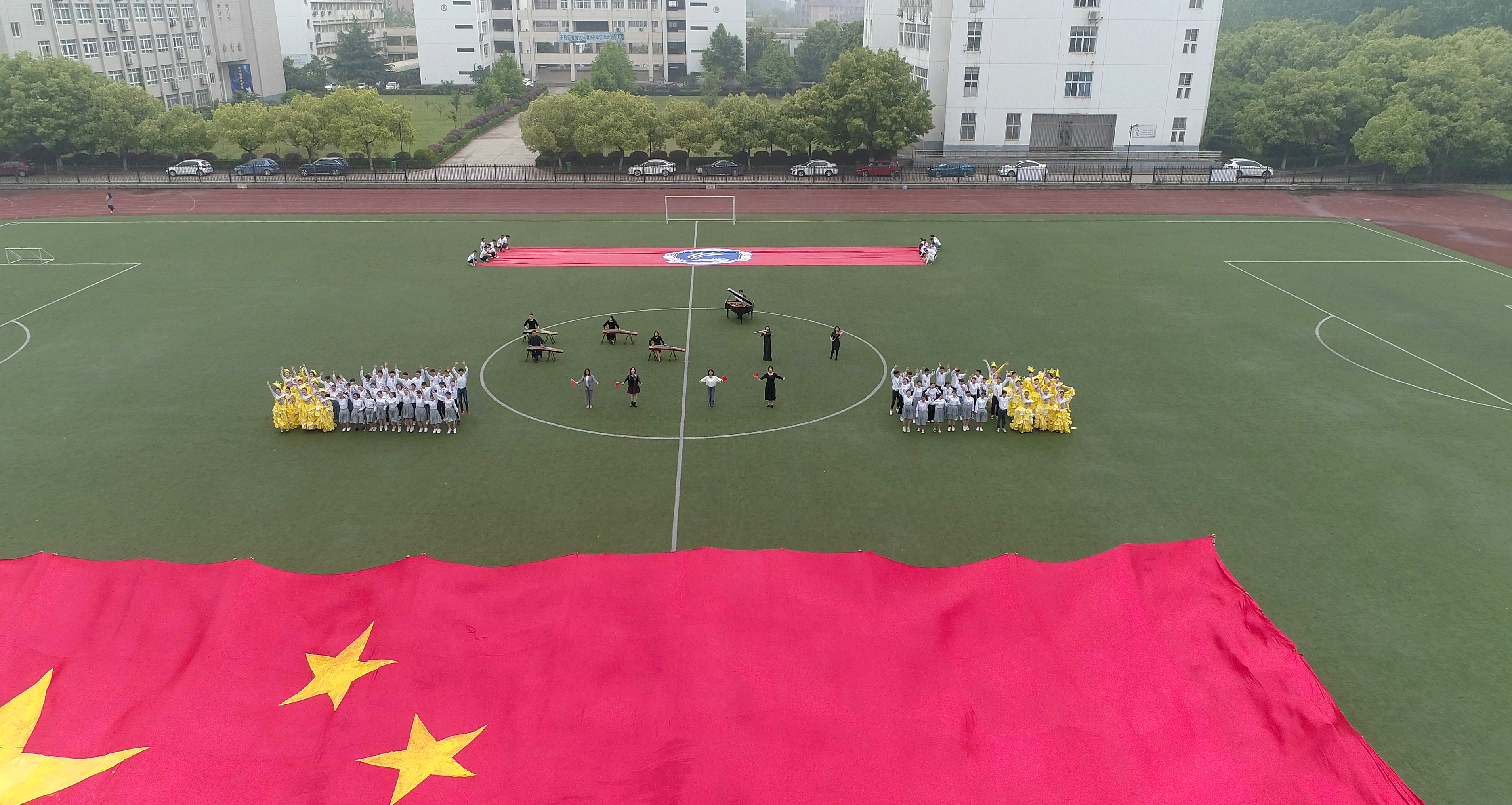 钢琴、古筝、长笛、小提琴……乐器演奏的老师,舞动青春的同学,还有可爱的合唱团、拼组而成的校徽条幅,伴随着缓缓展开的巨大国旗,共同绘制了对祖国繁荣昌盛的美好祝福。