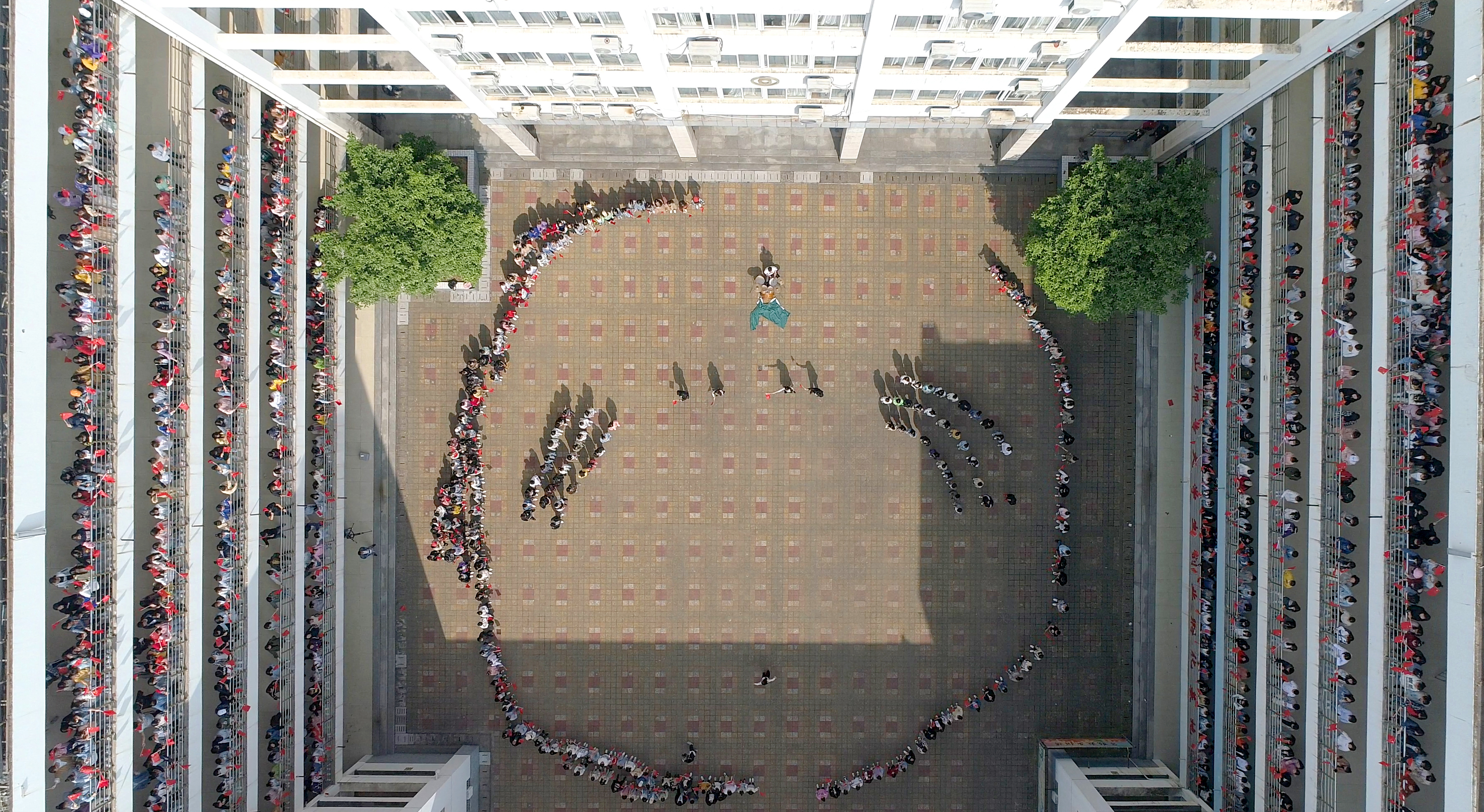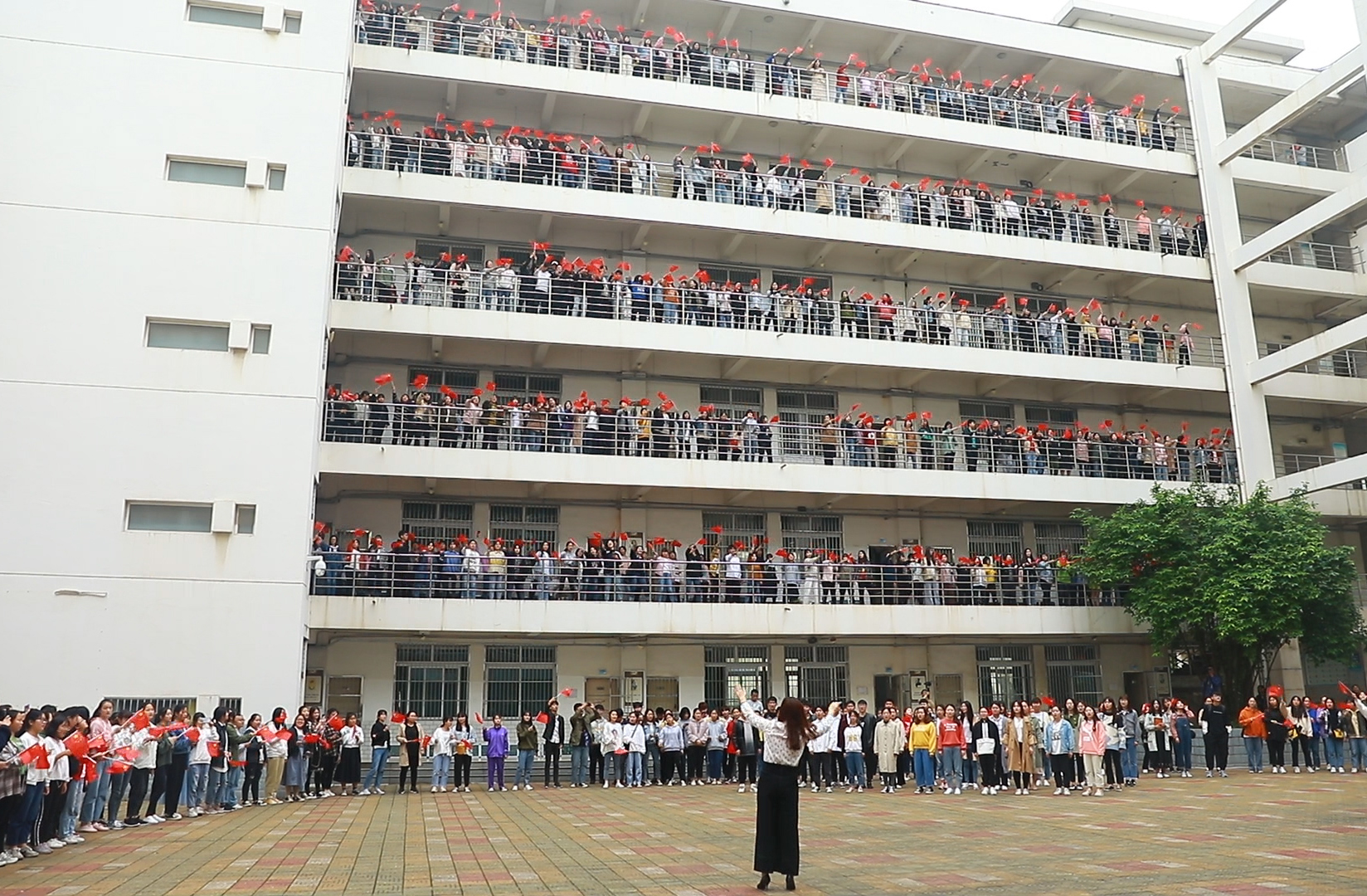 随着歌声的响起,天井四周和两边的教学楼陆续涌出莘莘学子加入到合唱队伍。他们手拿小红旗,挥舞着、歌唱着,跟随者指导老师的节拍唱响“我和我的祖国”。