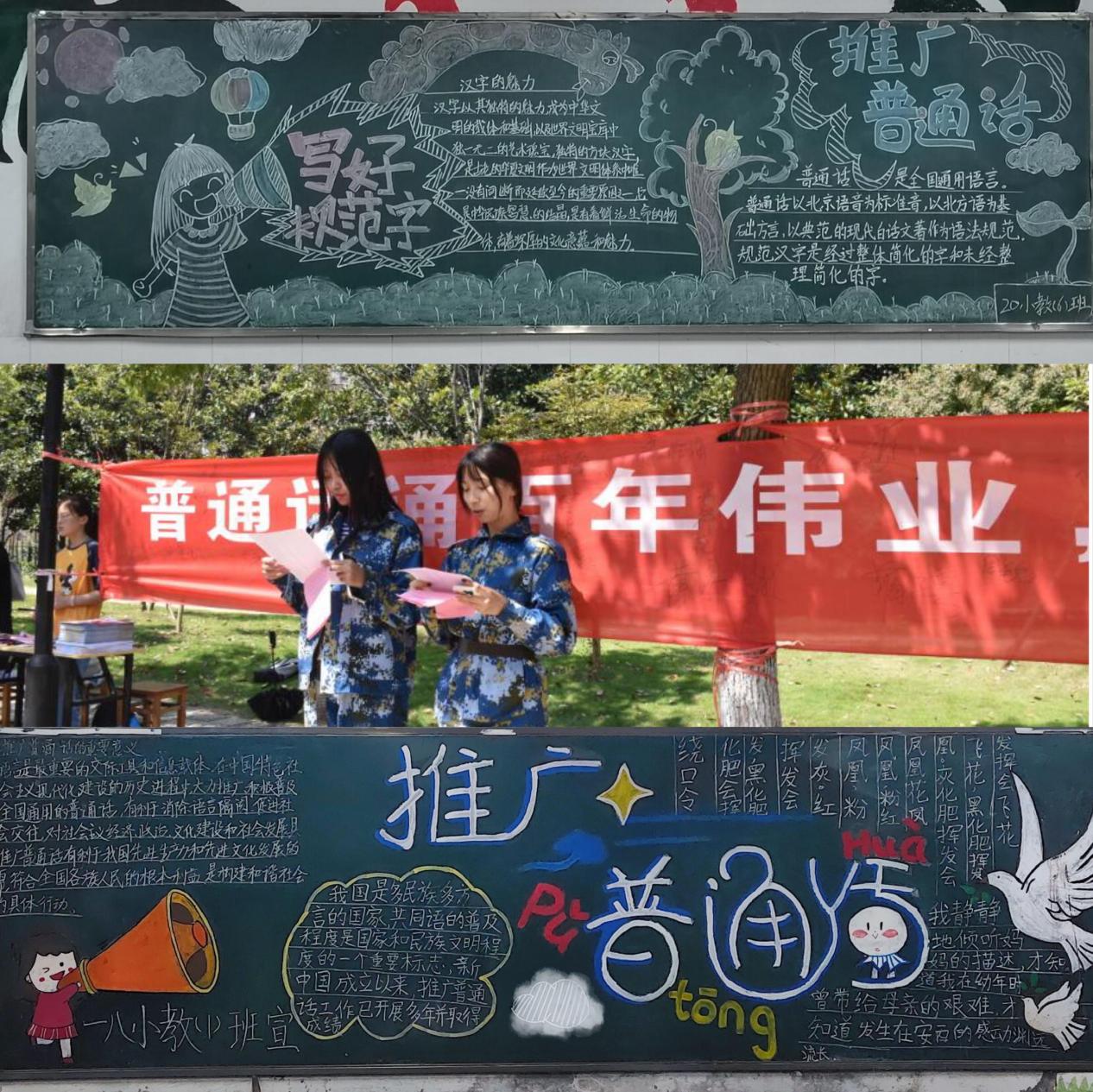 活动中,为有效扩大宣传力度,提升宣传效果,该系部组织在校学生和各班级利用手抄报、黑板报等载体,紧扣主题,以丰富的内容和图文并茂的形式,营造了浓郁的校园语言文化氛围。该系部2019级小学教育(3)班李明珠在采访中说道:“作为一名师范专业的学生,非常荣幸能参与到此次普通话推广周活动中来,我会始终热爱和使用普通话,用规范的普通话说出师专学子的时代强音。”