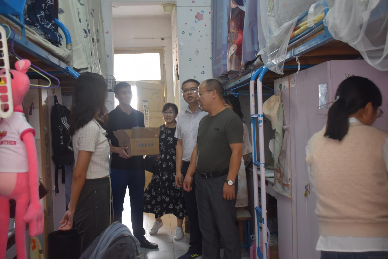 随后,周志亮、栗亮一行走访了该系部部分老生宿舍,为他们送去了中秋祝福。敲开寝室的门,同学们看到老师们带着月饼站在面前,带着惊讶的表情热情地邀请老师们进入宿舍,并对他们的到来纷纷表示感谢。师生们开心地聊着家常。周志亮表示:“节日虽然不能与家人团聚,希望在学校这个大家庭中能让你们感受到节日的温暖。祝大家的学业和生活像中秋的圆月一样,亮亮堂堂、圆圆满满。”除了送去节日祝福与慰问,周志亮还提醒大家做好寝室通风和防疫安全,并对学生反馈的鼠患问题进行了实地走访与调研。