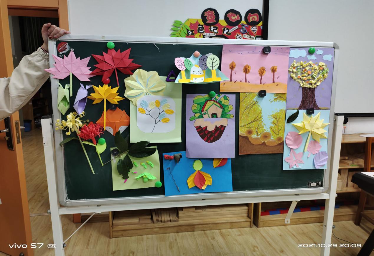 活动中,每个人都热情洋溢,各显本领,用绘画、纸工、黏土等方式去认真地完成作品,不慌不忙,整个实训室充满了欢声笑语。紧接着,陆陆续续有人开始上交自己的作品,展现在小黑板上的作品越来越多,每个作品都各有特色:有秋收的麦子,田野里的稻草人,成熟的果实,还有秋天的桂花、枫叶、蓝天、白云……作品充满着秋天的喜悦和温暖,每个作品都栩栩如生、惟妙惟肖。创作者们也积极踊跃地向伙伴们讲述着自己作品的故事:有的同学心中的秋是金黄的,是丰收的稻子、是成熟的果实;有的同学心中的秋是香气四溢的,是桂花的芬芳,田野的稻香,泥土的芳香和果实的甜蜜;有的同学心中的秋是温暖的,是酷暑之后的一阵微风,是味蕾上的享受……