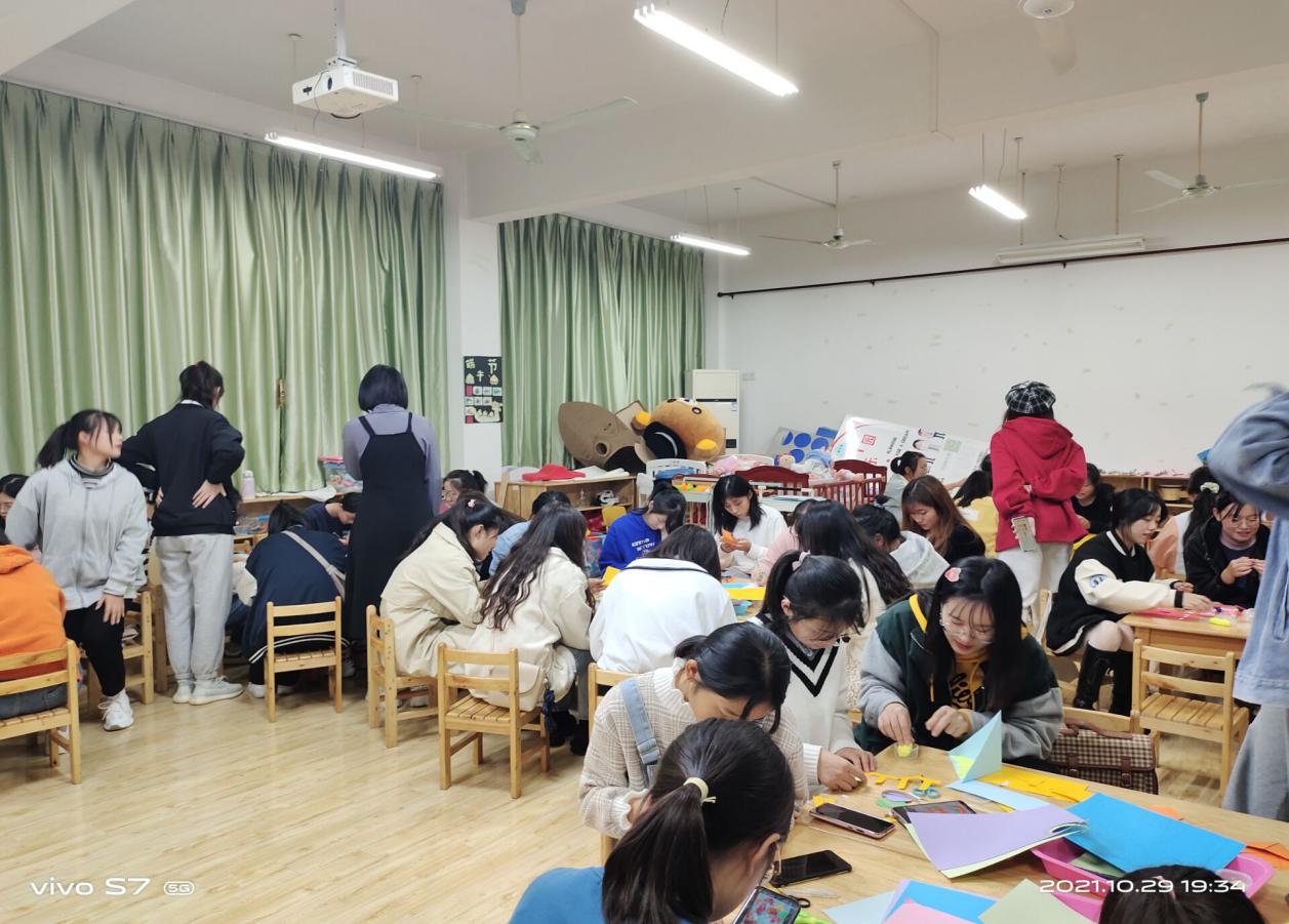 秋天,是一个令人向往、收获的季节,更是一个充满温馨的季节,为培养童乐园新成员的动手能力,10月29日晚,童乐园以“秋”为主题的美工活动在学前实训室如期举行。此次活动是2021级新生参与社团的第一次活动,新的面孔就像是初升的太阳充满阳光。