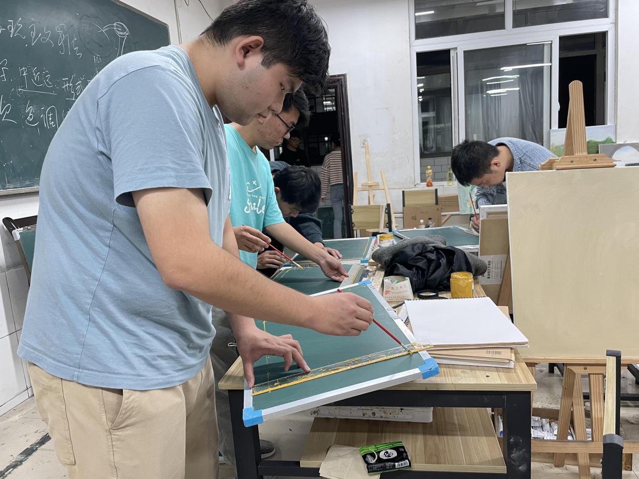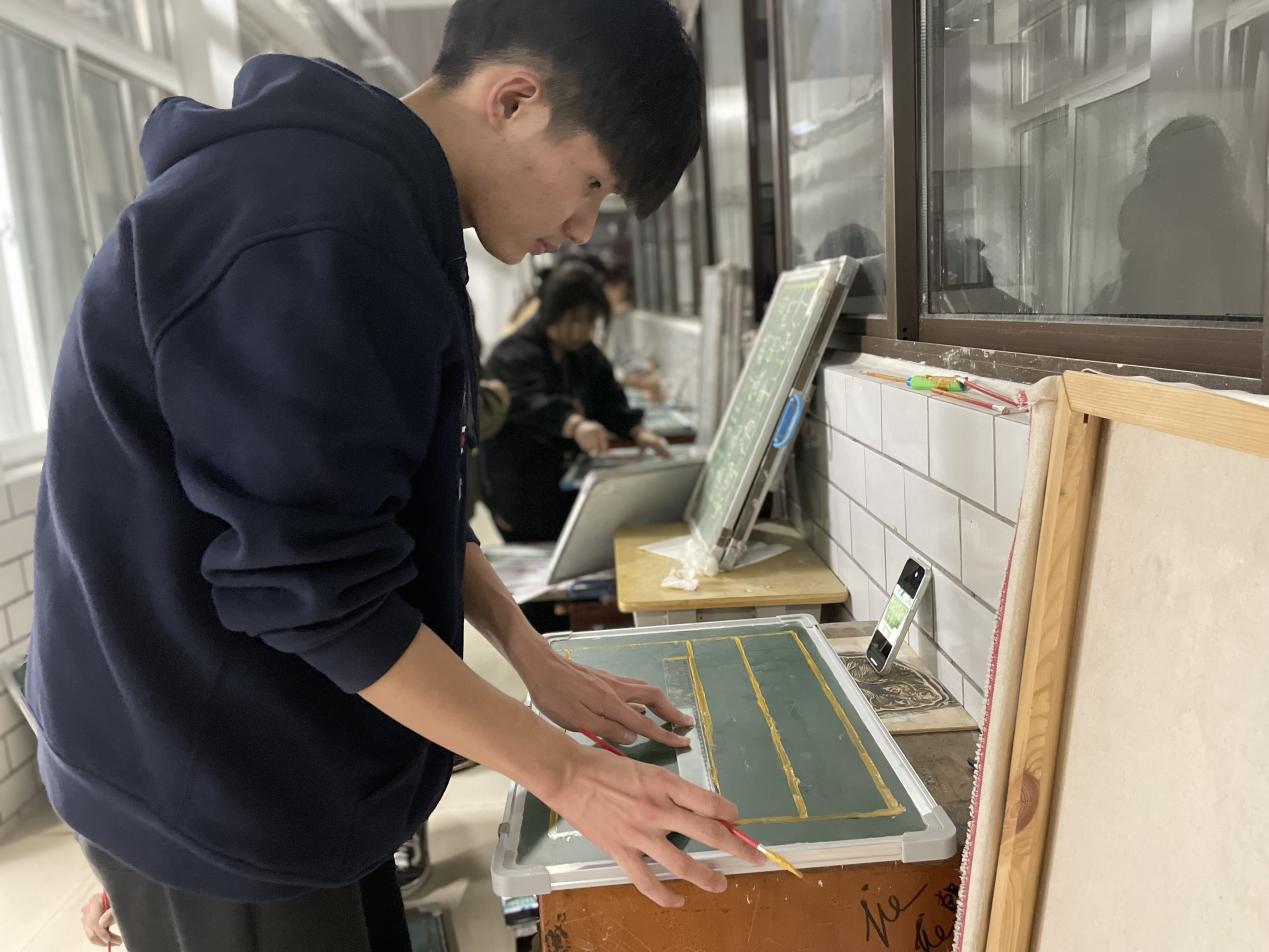 活动中,同学们按照工作分配认真有序地进行着绘制活动。拿到小黑板后,他们并没有立即动笔,而是用干净的纸把小黑板不停地擦拭,直至洁净如新,然后再用粉笔打型,最后是上颜料。虽然只是小小的一个米字格绘制工作,精细的操作和认真的态度足以展现出同学们良好的专业素养和对待该项工作的责任与担当。正如美术教育(2)班班长李嘉诚在采访中所说:活动让班级收获丰富,不仅给大家提供了团结合作的机会,让同学们在参与中锻炼了自己,也让大家体会到了用自己的专业技能帮助到他人的成就感。