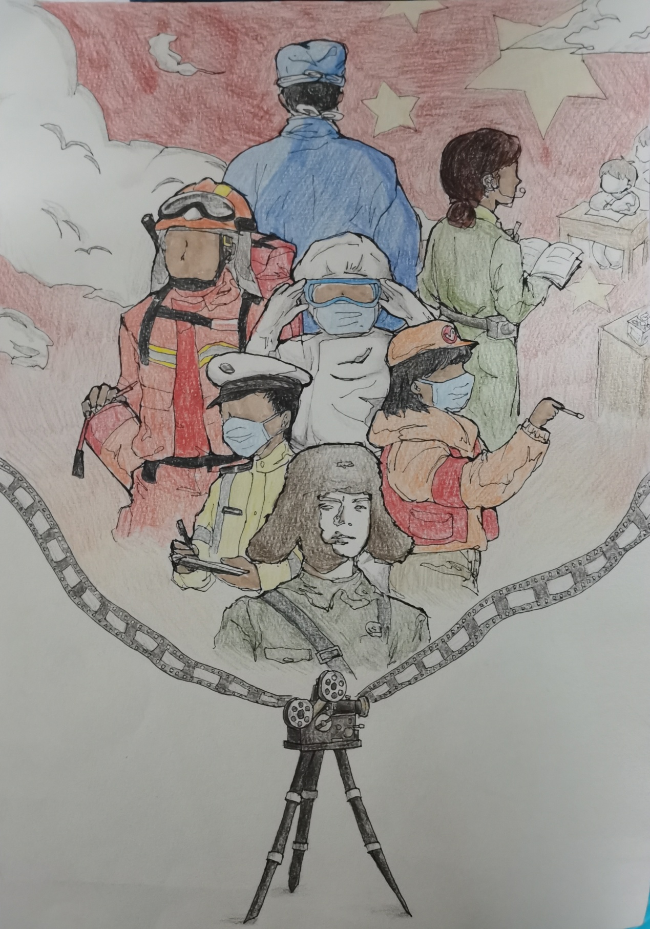 作品选取了几个具有代表性的职业,以群像的形式展现在画面当中。奋斗在抗疫一线的医务人员、警务人员和消防人员,以及默默奉献的志愿者和教育工作者。他们都有着伟大的精神——雷锋精神。记忆就像图中的放映机,时代在变迁,但他们的精神会镌刻在历史长河中,永远铭记于我们心间,让我们向他们看齐。雷锋从未走远,他就在我们身边。