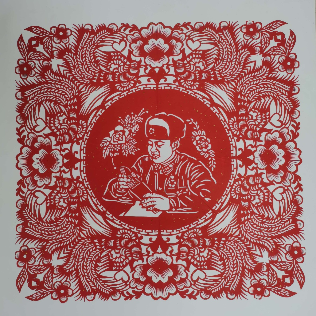 作品正中央是雷锋同志在清点自己的津贴,把它装进信封里去帮助那些需要的人。剪纸四周是花鸟簇拥,代表了繁荣昌盛,这也是雷锋生前心中所想所愿。