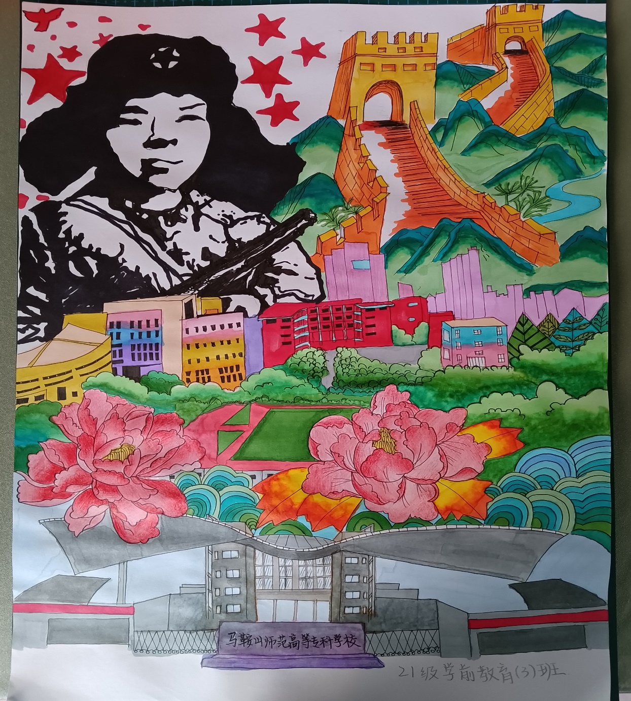 这幅画由雷锋、长城、牡丹和校园建筑组成。作者将自己的学校用画纸展现,并赋予它多彩的颜色,意在说明马鞍山师范高等专科学校也有很多像雷锋一样善良、乐于助人的老师和同学,我们称之为“活雷锋”。疫情封校期间,他们和同学们坚守在一起,舍己为人、无私奉献。长辈们曾说:“哪有什么天使,不过是一群孩子换了一身衣服。”世界上没有从天而降的英雄,只有挺身而出的凡人。他们不怕苦、不畏难,用臂膀扛起了如山的责任。