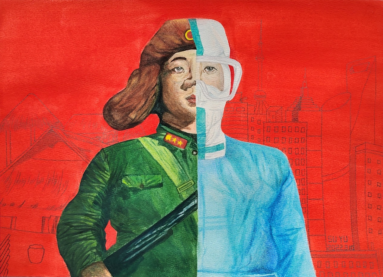 作品背景鲜艳的红色代表着我们的祖国,红色背景中隐隐约约透露出的旧时代建筑物和新时代建筑物形成对比,体现出祖国的飞速发展。主题人物分别为雷锋和医护人员,他们身影重叠。光线从不同的方向照向他们,虽然不在同一世纪,但他们的眼睛和心始终向着同一个方向,那就是人民的方向。抗疫医护人员们,用自己的血肉为这个国家筑起了一道防护墙,他们不怕苦、不怕累,将雷锋精神融入自身岗位,用实际行动诠释着医务工作者“敬佑生命、救死扶伤、甘于奉献、大爱无疆”的责任和担当。医务人员这种甘于奉献,为人民服务的精神正是一种对雷锋精神的传承和延续。我们作为当代青年,更应该在生活中践行这种精神,从生活的点滴小事做起,不以善小而不为,向雷锋同志学习,自觉发扬、传承雷锋精神。