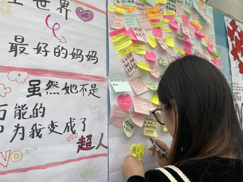片刻,展板上便密密麻麻的写满了对妈妈的祝福语,其中18级小学教育2班石琳怡写到“小棉袄会努力成为妈妈的防弹衣”,18级小学教育3班程丹写到“妈妈是超人,也是时光深处最温柔的人”,还有“祝天下妈妈天天开心,身体健康!”“祝妈妈永远年轻漂亮!”“感谢妈妈的碎碎念念,温暖我岁岁年年”等等。妈妈,是所有语言里不需修饰,不用学习就能叫出来的最美妙动听的两个字。这些便利贴上简洁朴实的语言蕴含着同学们对妈妈的浓浓爱意,这种争先恐后的盛况也达到了教育引导同学们懂得感恩的目标。