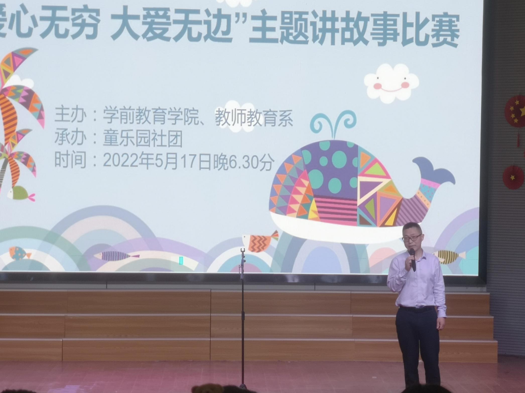 为了提高学生语言表达能力,促进学生专业成长,5月17日晚,由学前教育学院和教师教育系主办、童乐园社团承办的“爱心无穷 大爱无边”主题讲故事决赛在校音乐厅举行。教师教育系党总支书记王结贵,艺术设计系党总支负责人、副书记、童乐园,指导教师吴德琴及学前教育学院部分教师参加了此次活动并担任评委。