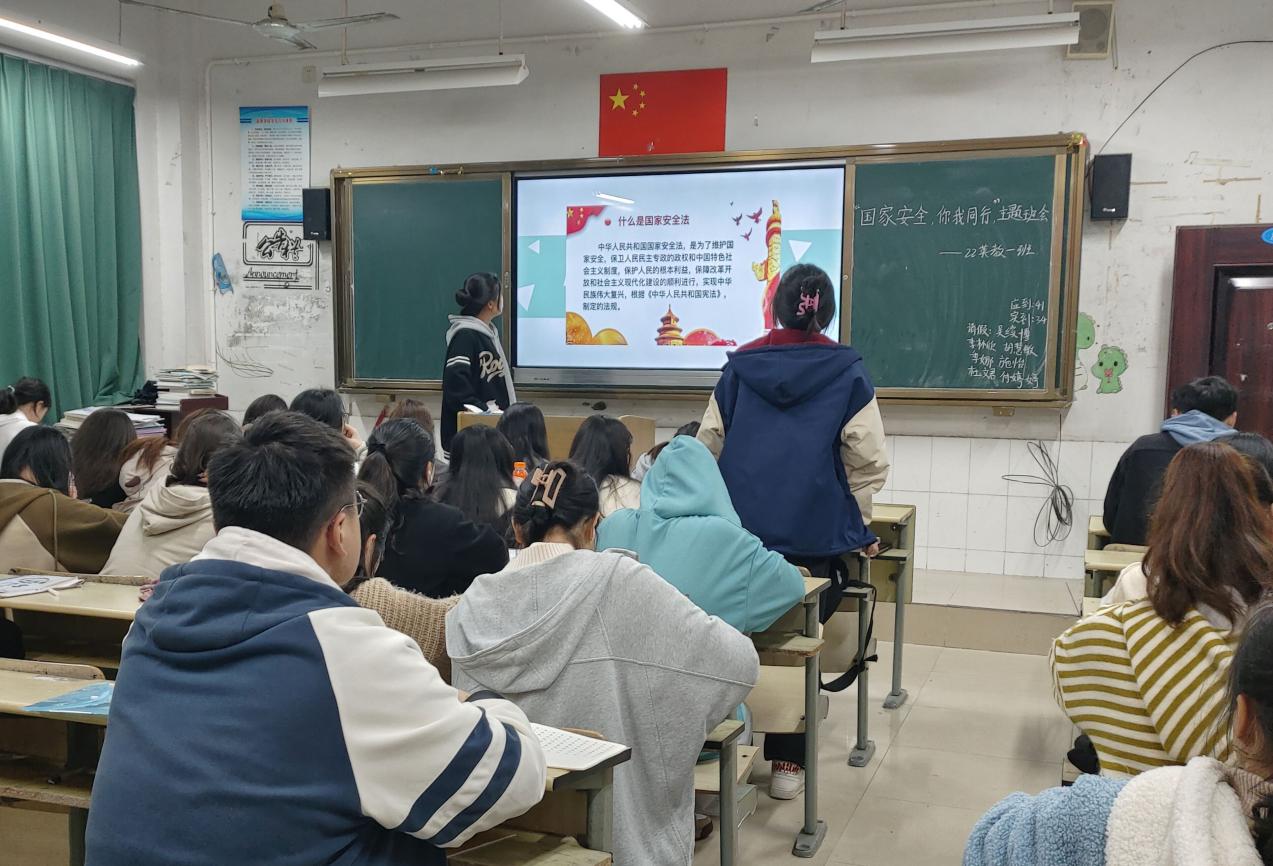 家是最小国,国是千万家。国家安全关乎着每个人的切身利益,保守国家秘密,公民人人有责。活动中,各班级通过自学、集中学习和交流讨论等方式认真学习了《中华人民共和国国家安全法》,营造了浓厚的国家安全教育保密法治学习气氛。共筑保密防线,守护国家安全。2020级小学教育(2)班负责人在班会中表示:自觉维护国家安全是每个人的责任,每位同学都应该认真贯彻执行《中华人民共和国国家安全法》的相关要求,为国家安全贡献自己的力量。2022级英语教育(1)班在认真学习国家安全相关法律的基础上,结合有关影视作品和反间谍宣传视频,让同学们认识到构筑反奸防谍人民战线的重要性,以及自身与国家安全的密切联系,懂得在生活中如何维护国家安全,并表示以实际行动共同参与到维护国家安全的各项工作中来。