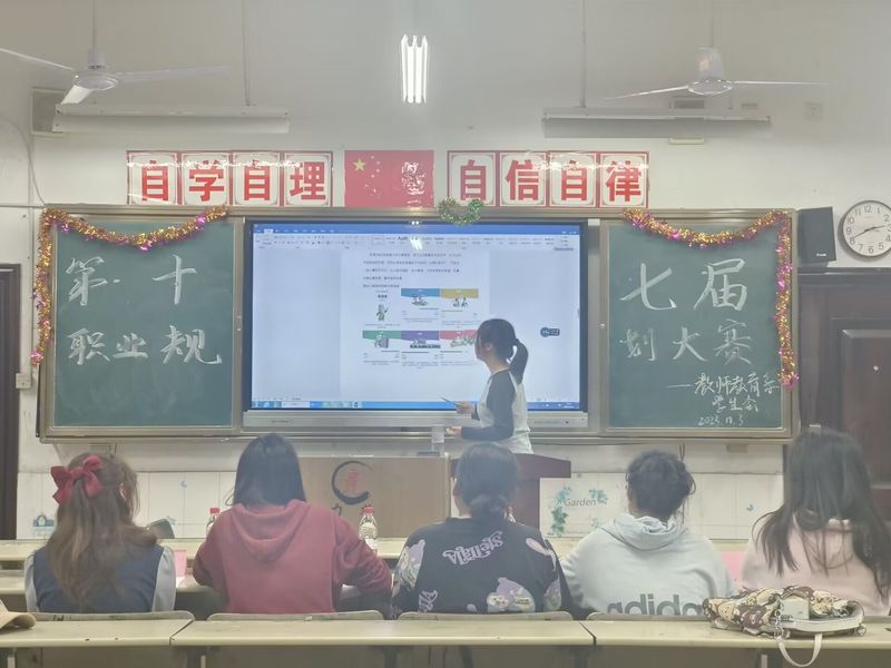参加比赛的选手不约而同的都选择了成长赛道。第一位作品的是20级小学教育(4)的涂意虹,他的作品:做乡村教育的守护者。从“自我认知,青春筑梦”到“总结感悟,不忘初心”,思路清晰,立意新颖,以成为教师为着眼点,挖掘乡村振兴在教育方面的需求,字里行间都流露出他对乡村教书这一工作岗位的热爱。接下来是22语文教育(1)班的鲍怡平,她从四个方面展开,发现社会存在职业焦虑问题,也表述了自己的职业愿。职业生涯规划比赛激烈的进行着,选手们结合自己的专业方向、学习技能、理想目标,畅想着自己的未来职业,并为之努力着。
