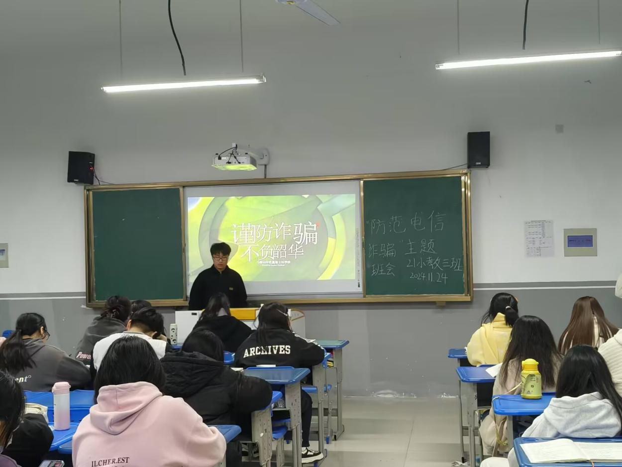 为了加强学生安全教育,教师教育学院于2024年11月下旬在各班级教室开展了开展防传销、防电诈、消防主题班会。此次班会旨在普及相关安全知识,帮助同学们树立正确的安全观念,营造安全和谐的校园环境。